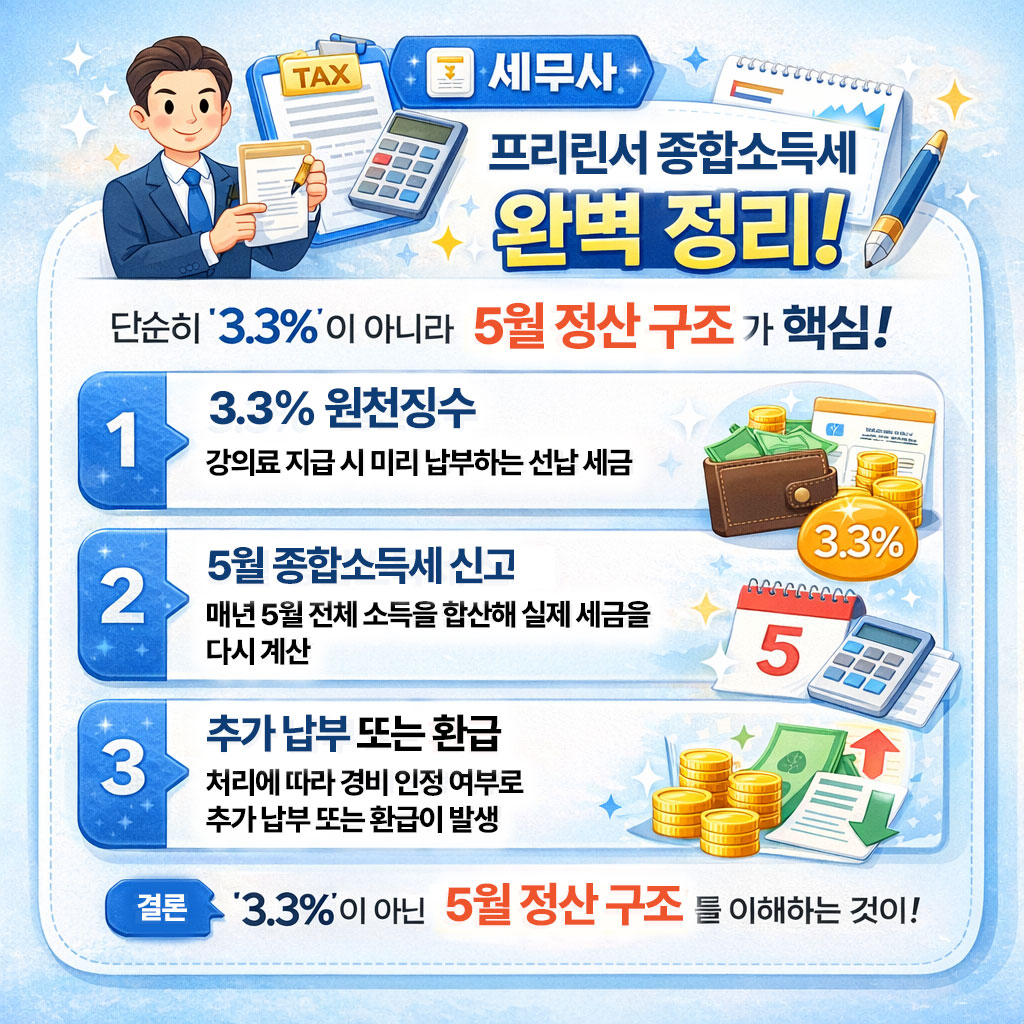 따라서 프리랜서 종합소득세의 핵심은 “3.3%”가 아니라 “5월 정산 구조”를 이해하는 것입니다.