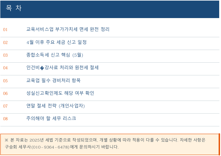 따라서 계약서 기준이 아닌 “실제 근무 형태”를 기준으로 소득 유형을 판단해야 하며, 이 부분이 교육업 세무에서 가장 중요한 리스크 중 하나입니다.