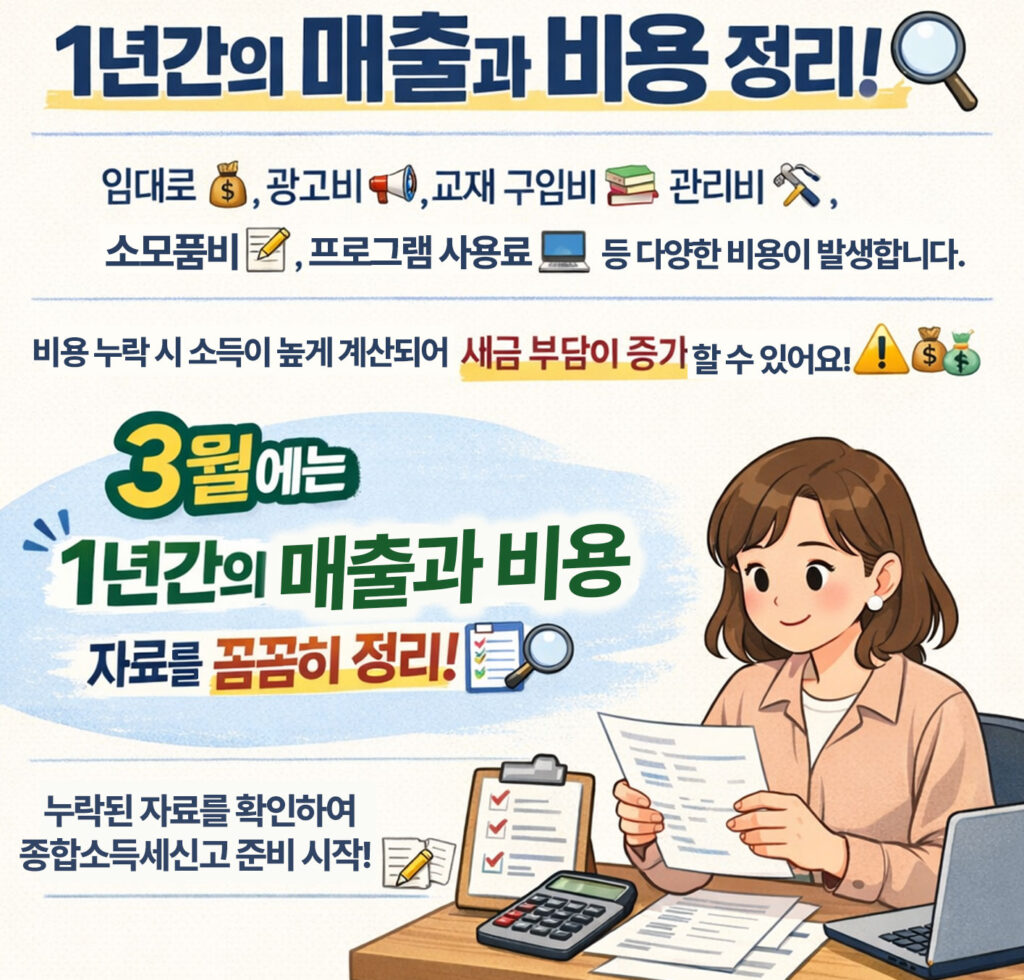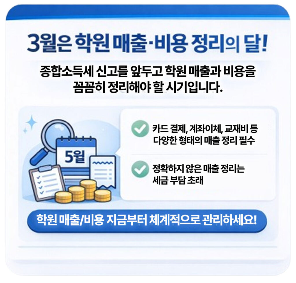 3월은 종합소득세 신고를 앞두고 학원 매출과 비용을 정리해야 하는 중요한 시기입니다.