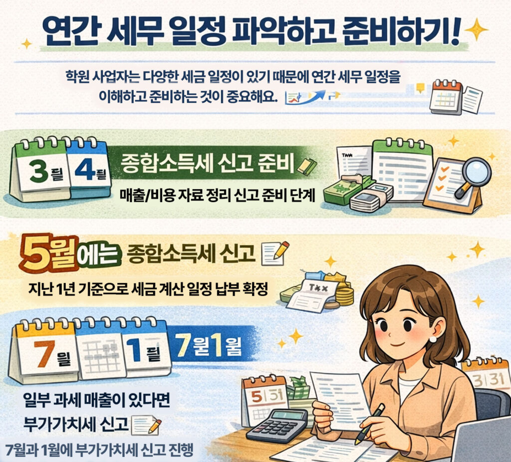 학원을 운영하는 원장님은 연중 여러 세금 신고 일정을 관리해야 하는데요.