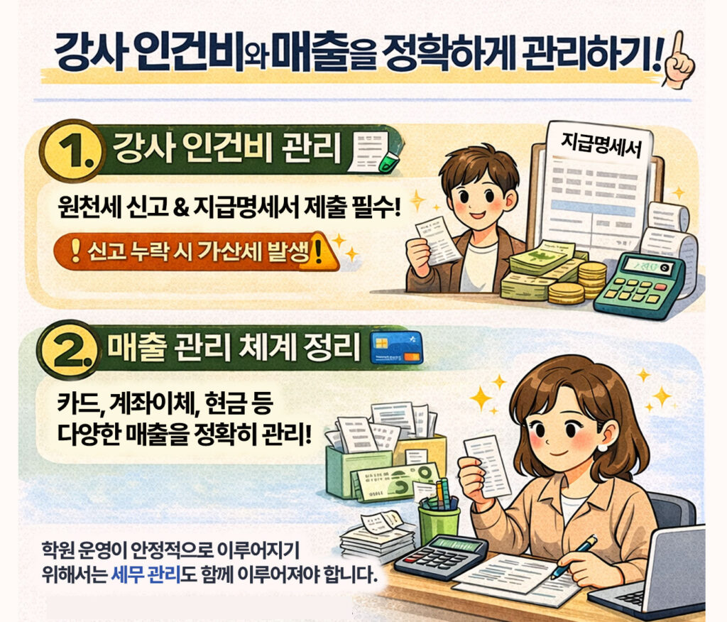 학원을 운영하다 보면 매출 관리부터 강사 인건비, 비용 정리까지 세무적으로 확인해야 할 부분이 생각보다 많습니다.